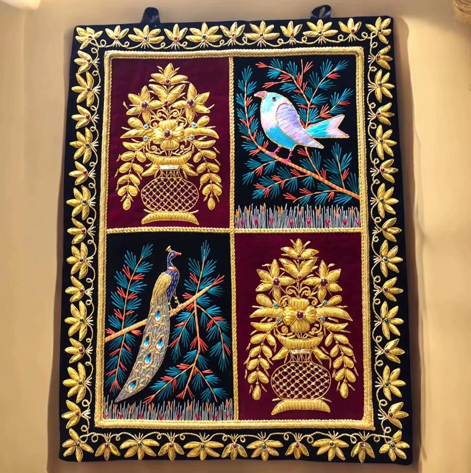 Tapisserie murale rectangulaire brodée à la main Zardozi, artisanat indien sur tissu de soie, art du tapis de bijoux