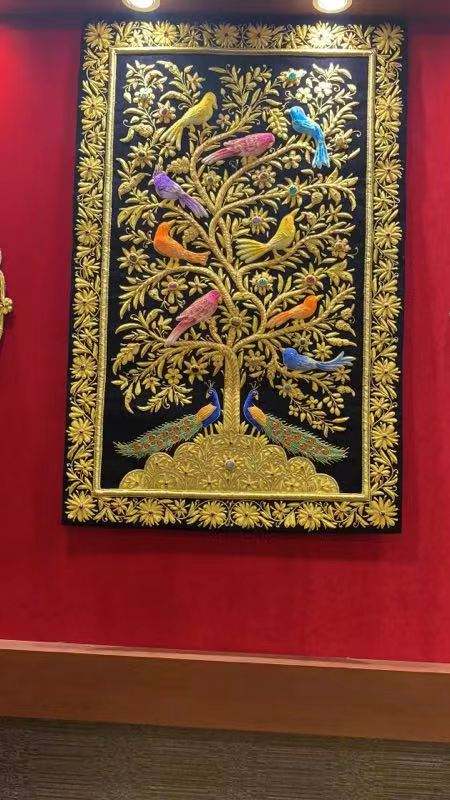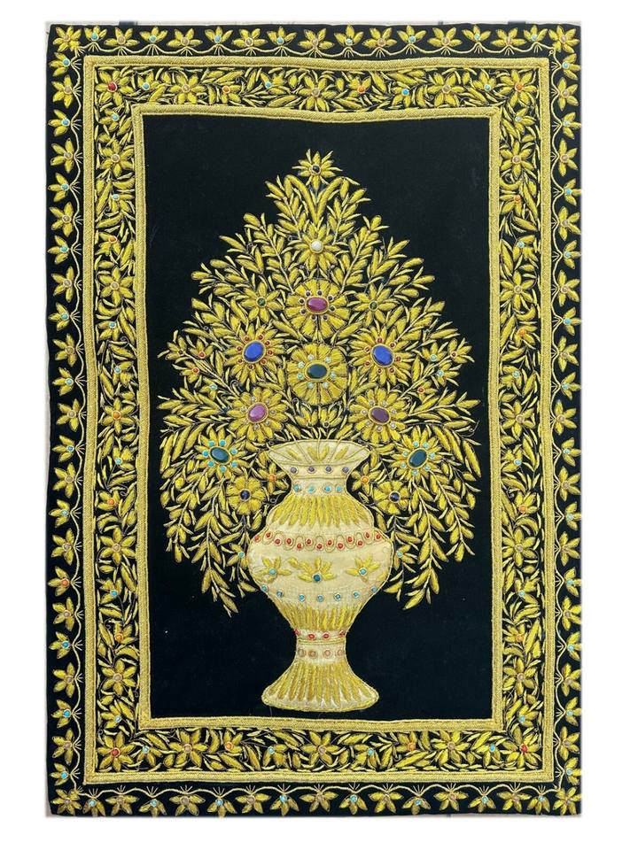 Tapisserie murale rectangulaire brodée à la main Zardozi, artisanat indien sur tissu de soie, art du tapis de bijoux