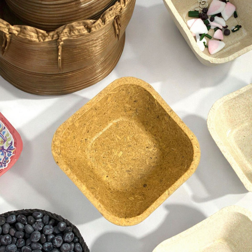 Bol en coque de riz zéro déchet, compostable à la maison et sans danger même si les animaux l'ont consommé par erreur grâce à la faible teneur en adhésifs et sans laminés.