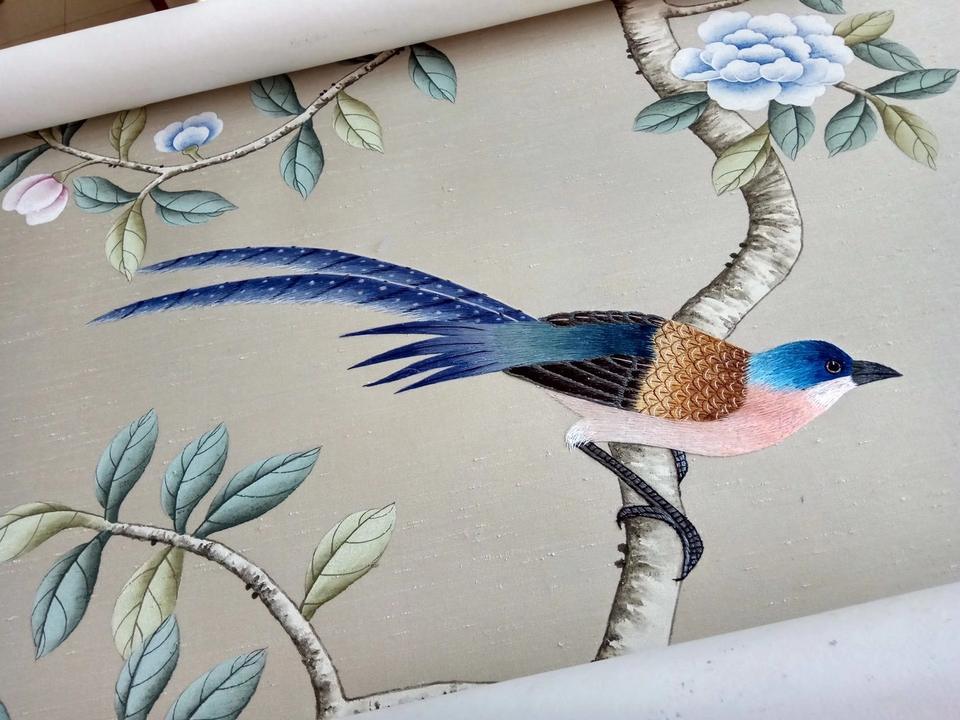 Zhenling luxe style chinois peint à la main Su broderie oiseau à longue queue papier peint en soie pour décoration murale d'hôtel