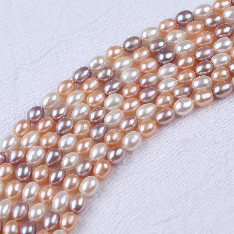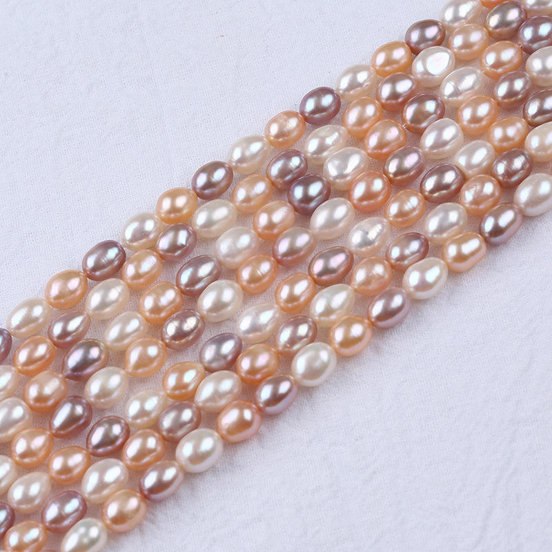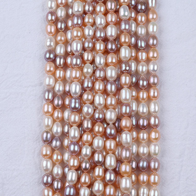 Perles d'eau douce en forme de riz Zhuji 7-8 mm, naturelles, blanches, poudre avec des couleurs mélangées de violet pour collier et bracelet DIY