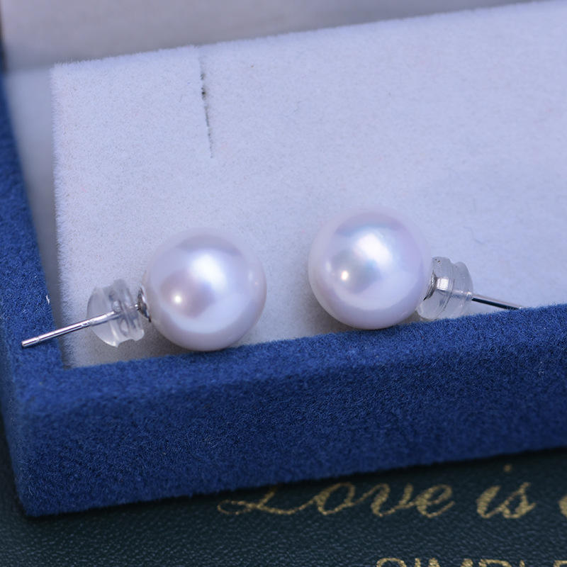 Zhuji Danshui 11-12mm White Round S925 Silver Stud Earrings Strong Light Fine Flaws Pearl Earstuds with Mesh Elegant Durable
