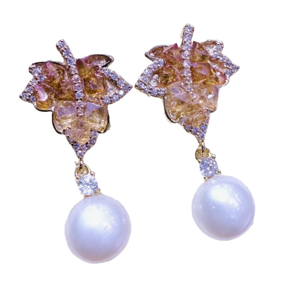 Zhuji Original Manufacturer's Freshwater Pearl Earrings Versatile Gradient Crystal Design Autumn Red Maple Fresh Sweet Fashion