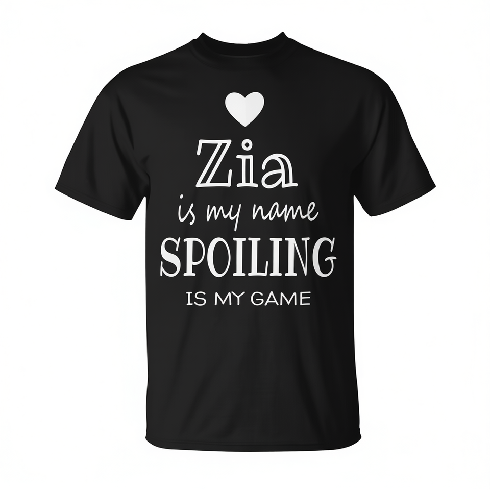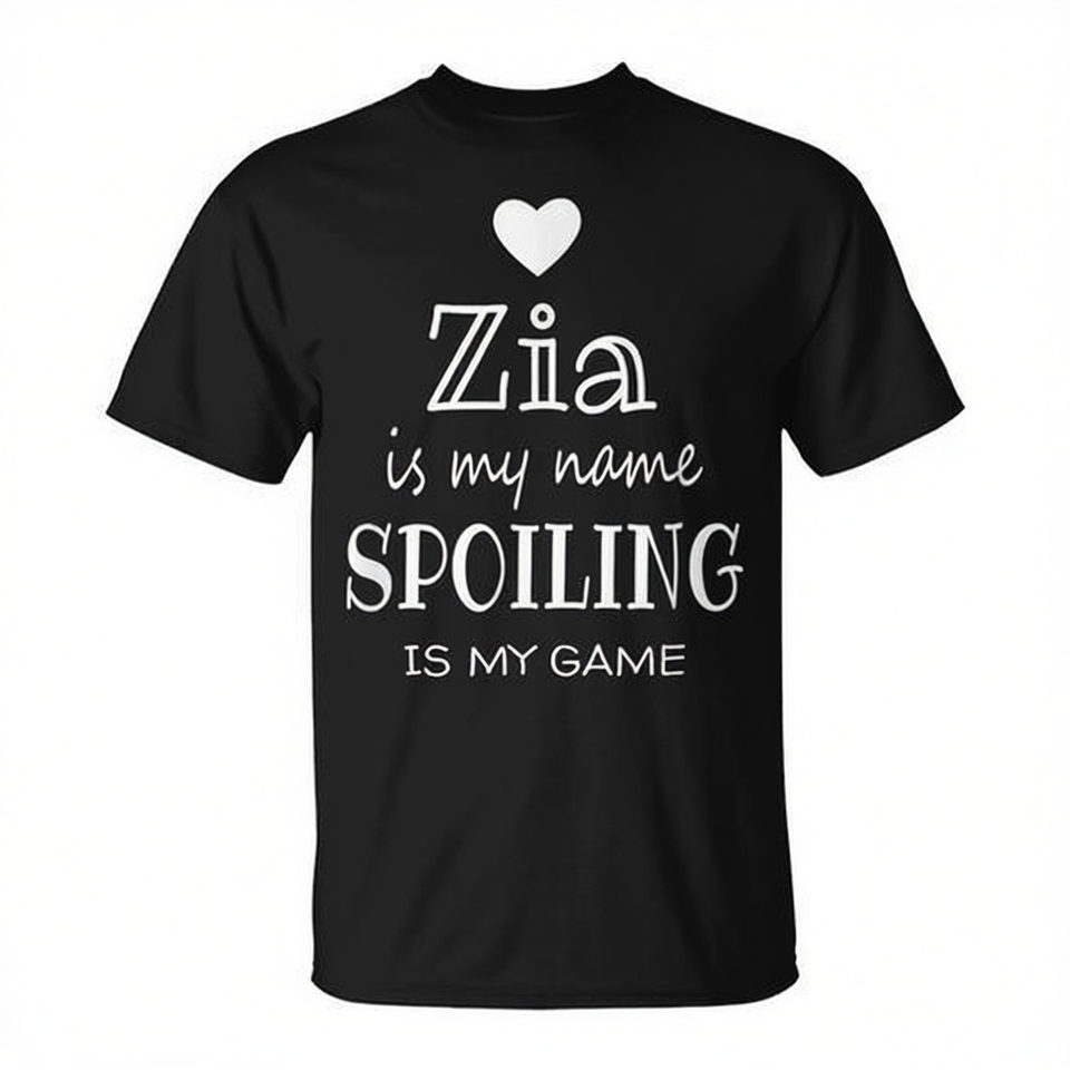 Zia Is My Name Spoiling Is My Game T-Shirt noir unisexe à col rond et manches courtes, cadeau pour réunion de famille pour adultes