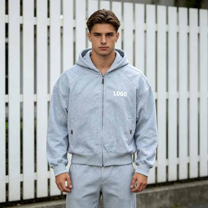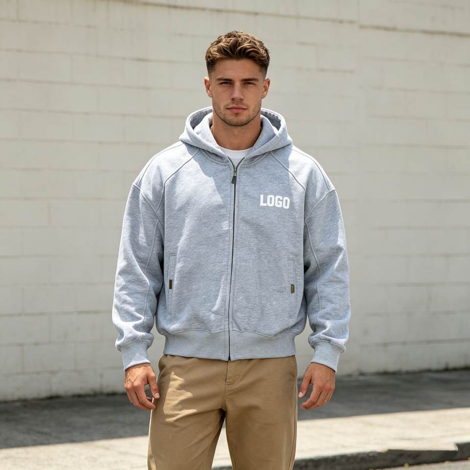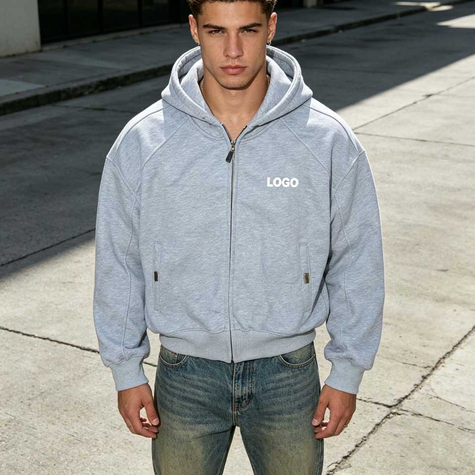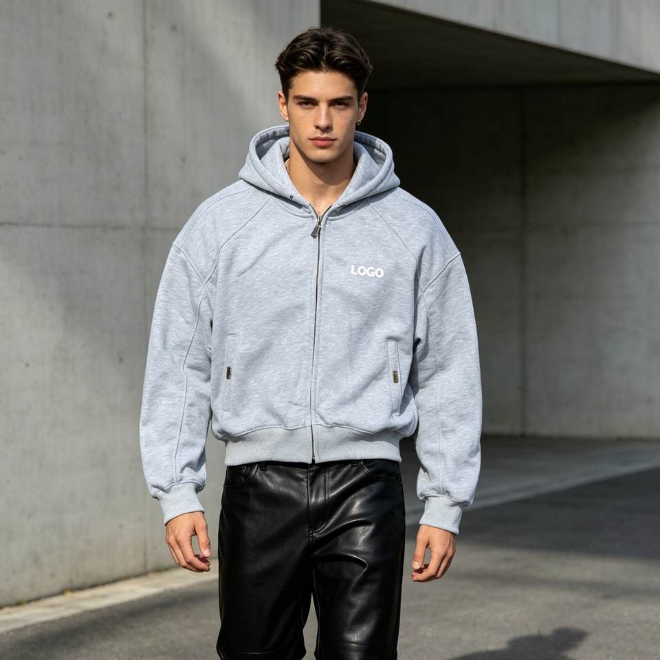 Sweat à capuche zippé pour homme, effet déchiré et vieilli, impression en relief délavée à l'acide, en molleton bouclette 550G 100% coton, service OEM