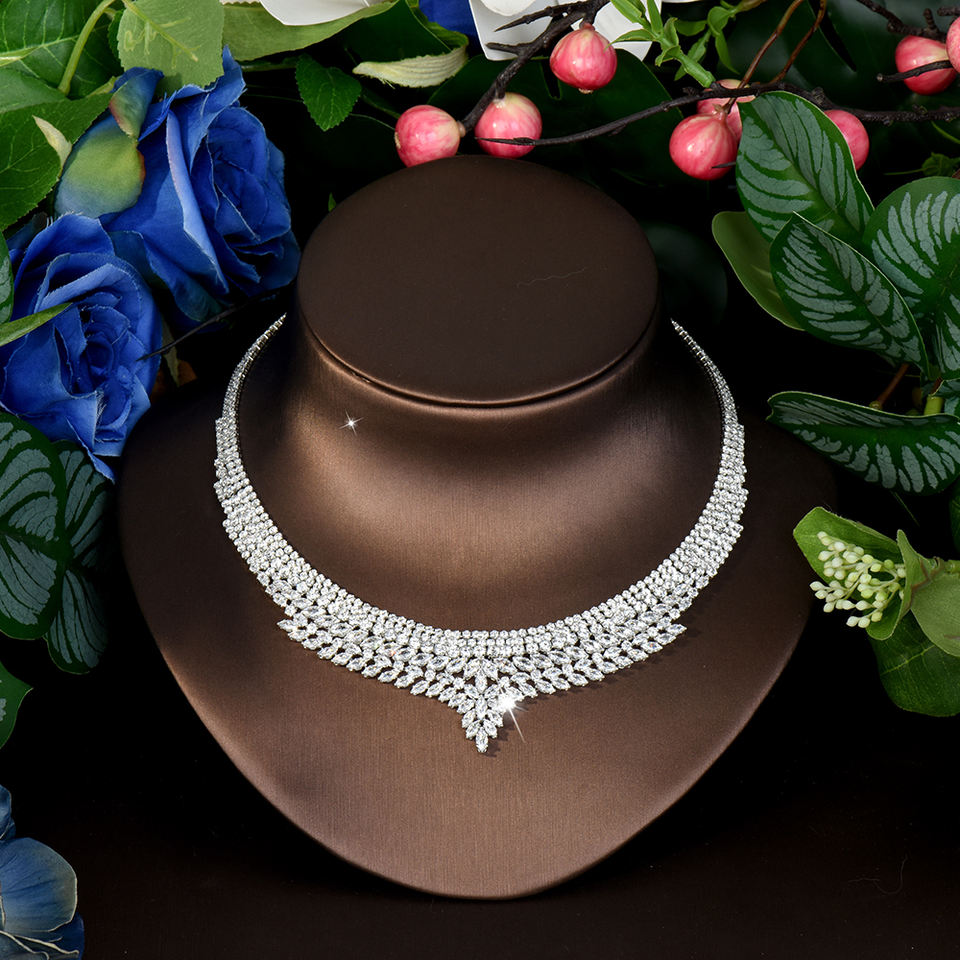 Zircons feuille forme balancent goutte fête boucle d'oreille et collier africain nigérian CZ couleur blanche ensemble de bijoux de mariage pour les mariées S-470