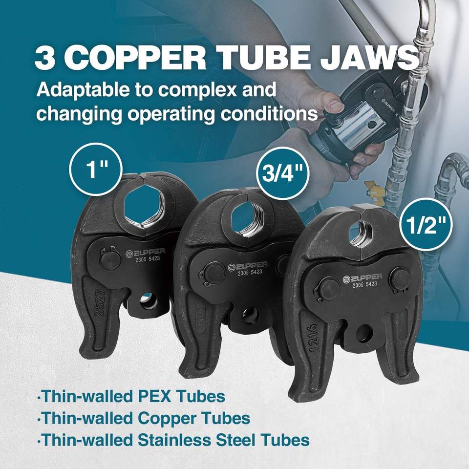 Zupper PZ-1930 Mini Pro Press Tool Kit avec 1/2 ", 3/4", 1 "Pro Press Jaws pour Copper Viega, 2pcs Battery