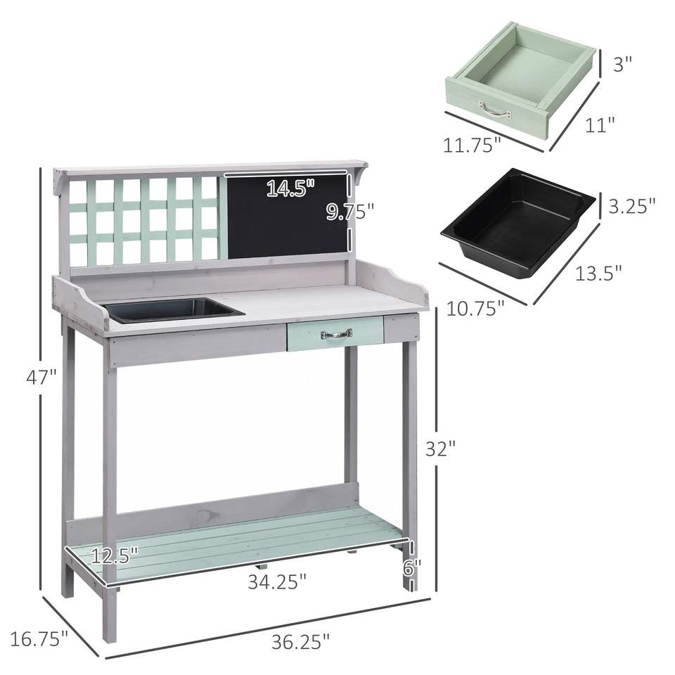 Banc de jardin gris clair avec évier amovible, tableau noir, étagère ouverte et panneau de rangement grillagé pour jardin et cour arrière
