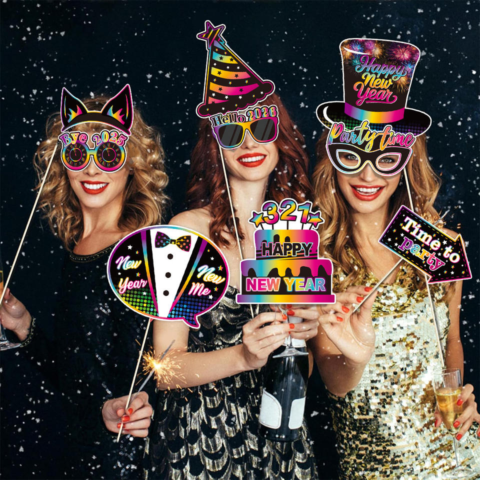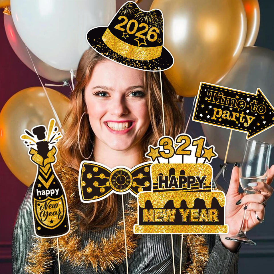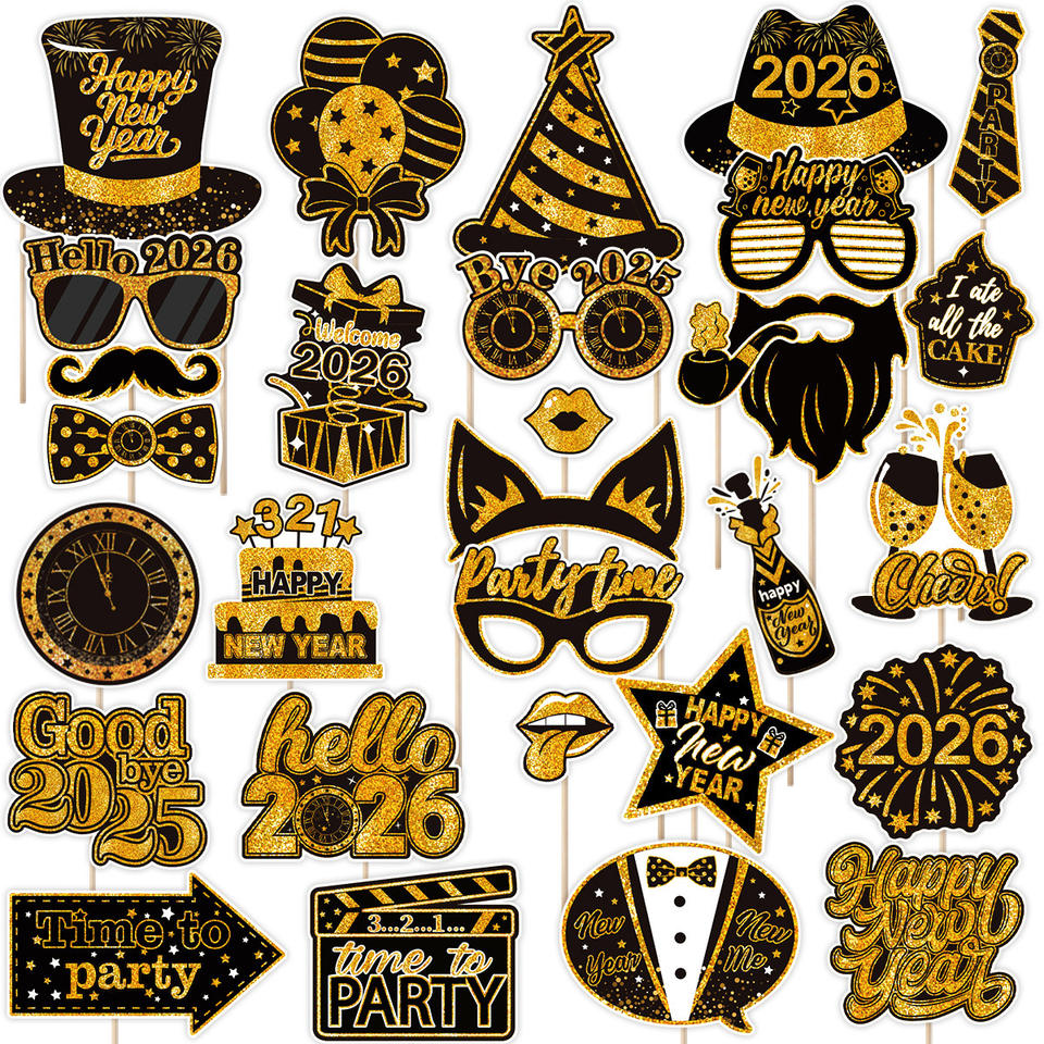 Accessoires photo amusants pour la fête du Nouvel An, masques photo décoratifs à main pour la veille du Nouvel An, photos noires et dorées