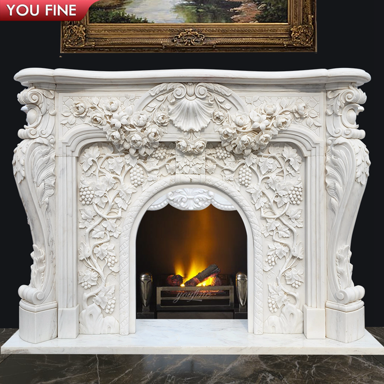 Cheminée en marbre blanc de Versailles avec étagère et sculpture florale