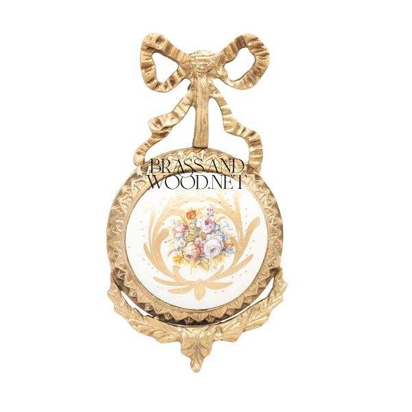 antique brass decorative ornate frame with porcelain painting of floral bouquet golden ribbon design vintage artwork home decor