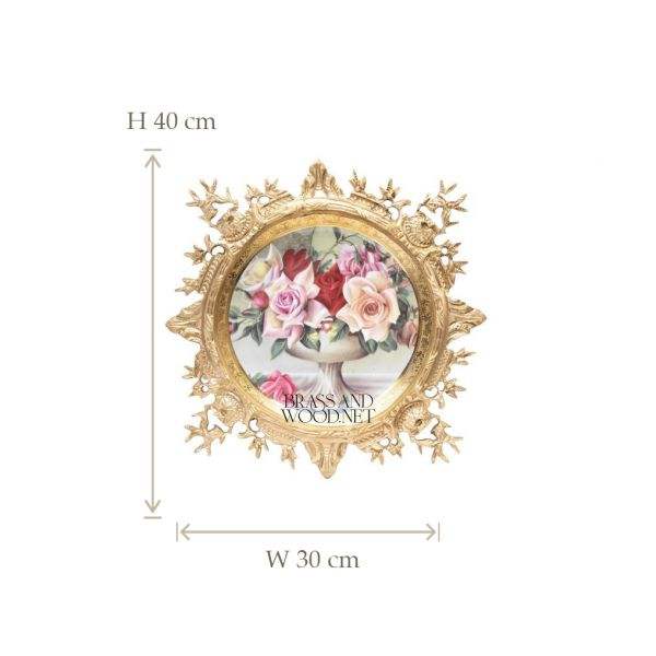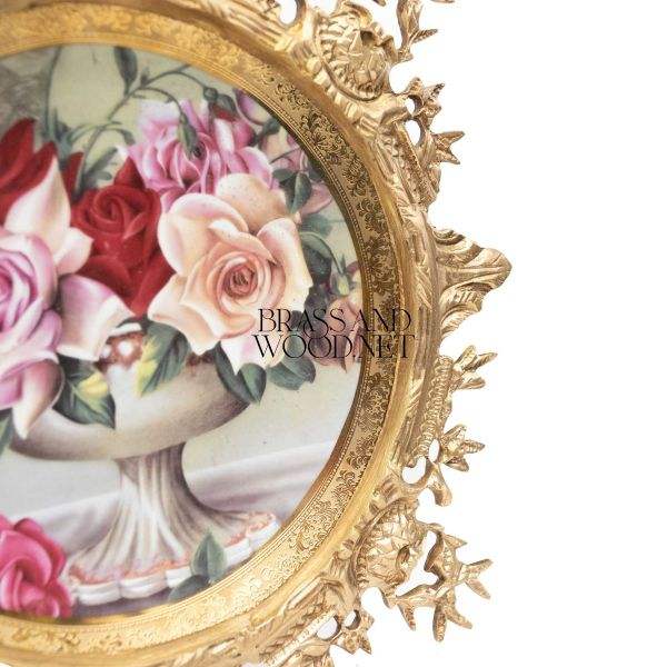 antique brass decorative ornate frame with porcelain painting of roses in vase golden sunburst design vintage artwork home decor