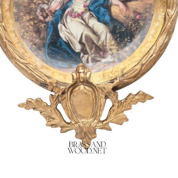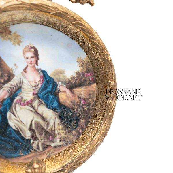 antique brass round wall frame with ornate golden decoration featuring hand painted portrait of elegant lady in classical attire