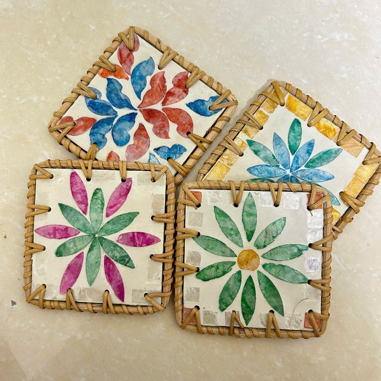 artisanal round rattan placemat with mother of pearl inlay vintage rustic style insulated tea coaster wholesale