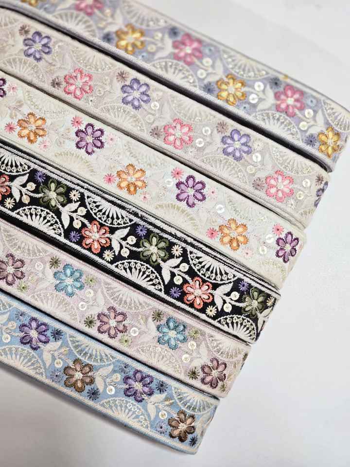 Beau ruban brodé floral multicolore avec des paillettes pour des applications de vêtement et des frontières décoratives