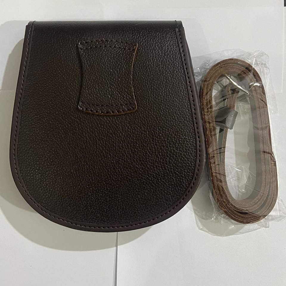 brown leather sporran, a traditional Scottish pouch that functions as a pocket for a kilt