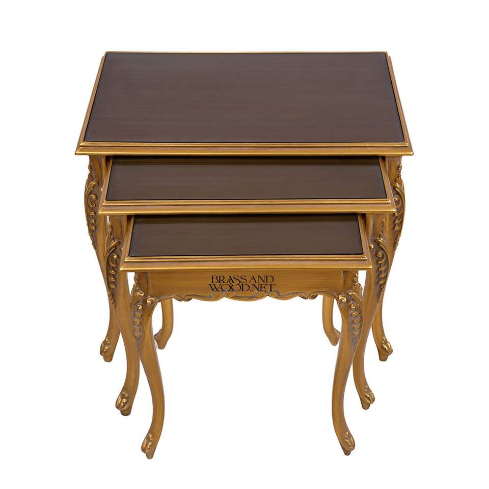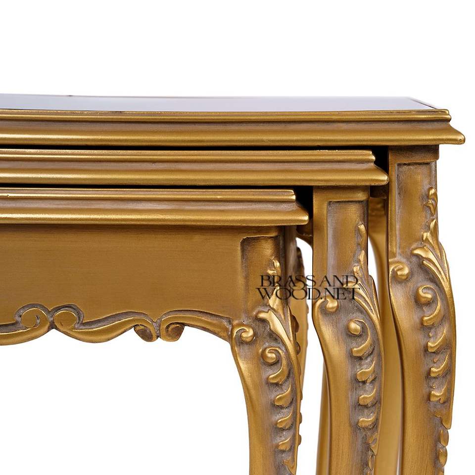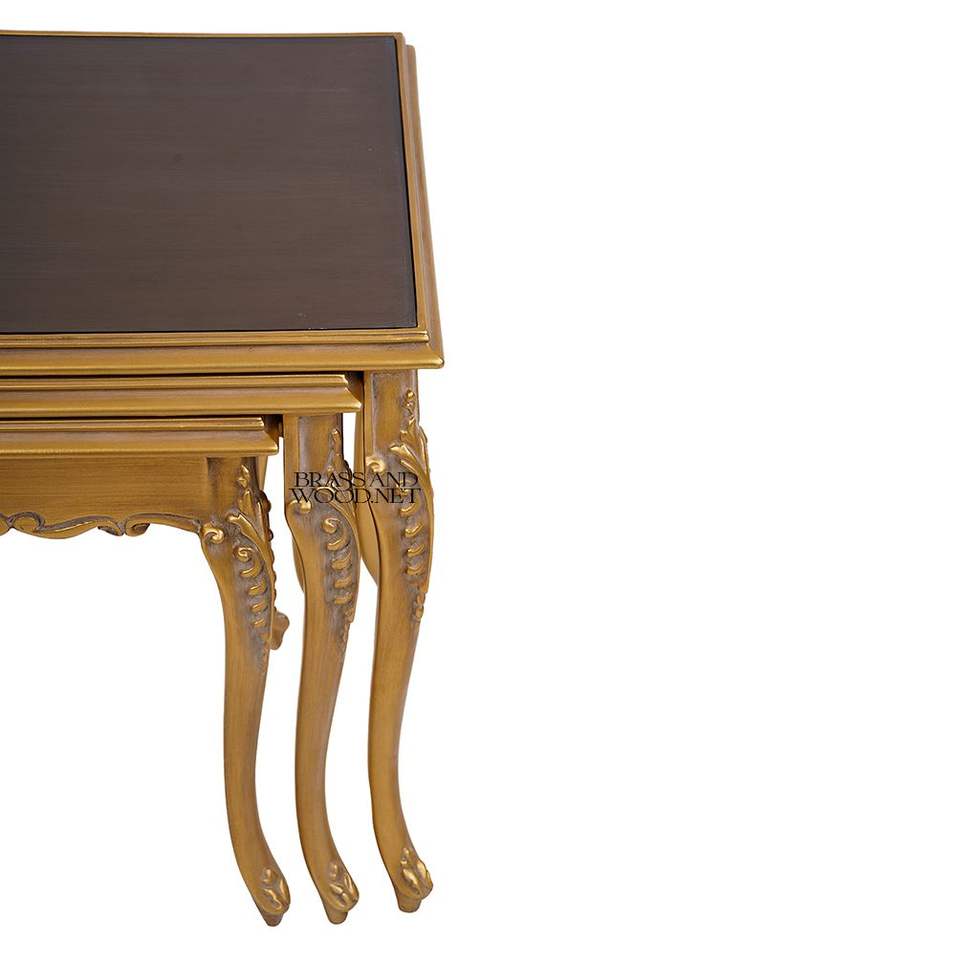 Ensemble de tables gigognes classiques en or avec dessus brillants foncés et pieds courbes élégamment sculptés à la main pour une décoration intérieure de luxe