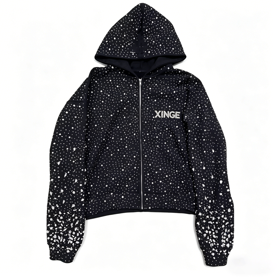 Sweat-shirt à capuche zippé surdimensionné noir avec strass, style streetwear pour homme