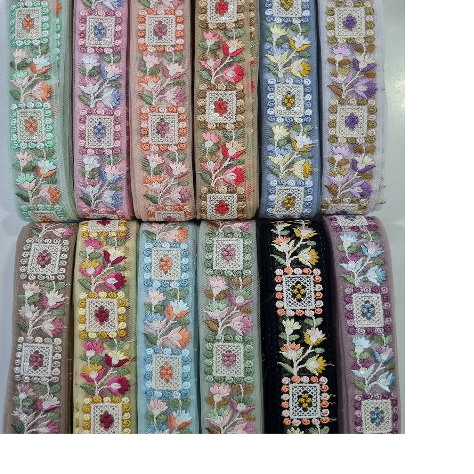 Custom Made Machine Embroidered Ribbons & Laces in Floral & Geometrical Designs & in Twelve Colours for Wedding Dresses