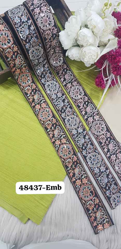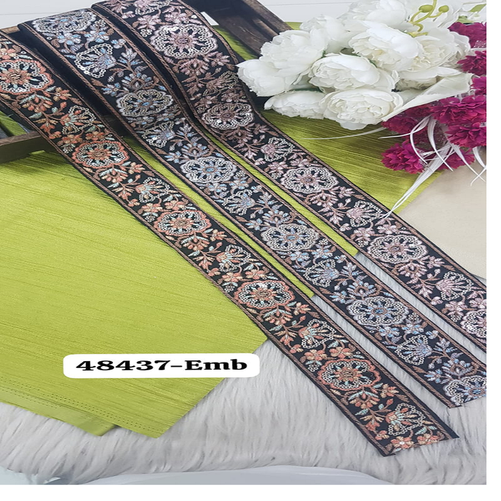 Fait sur mesure sur des lacets brodés en tissu de base noir en fil multicolore avec broderie de paillettes assorties en 1.5 pouces.