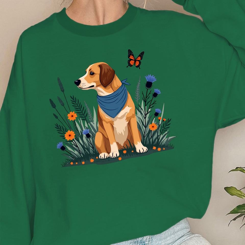 dog with plants and flowers women's sweatshirts