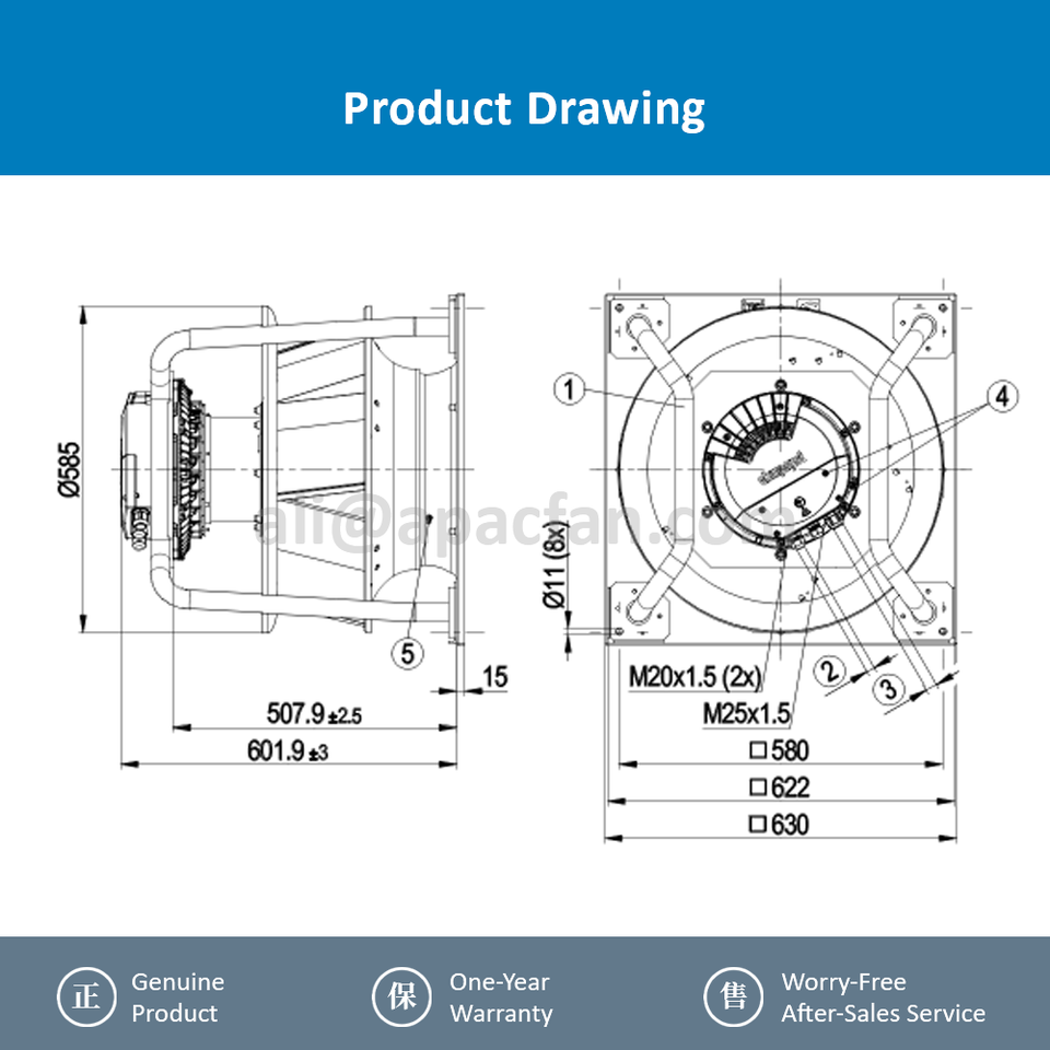 ebmpapst K3G500-PC16-L1 400V AC 3350W 5.1A AHU Unité de Traitement d'Air Climatisation de Précision Ventilateur de Refroidissement
