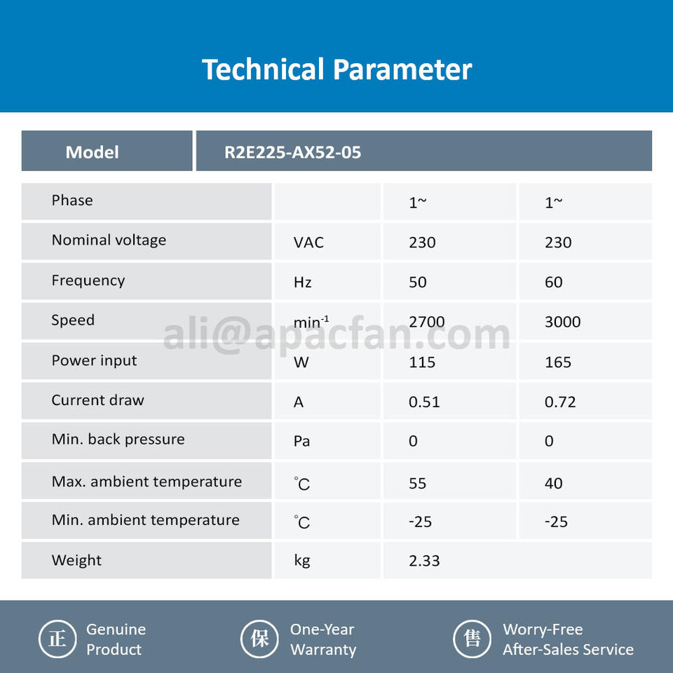 Ventilateur centrifuge de refroidissement à roulement à billes 225 mm, 230 V CA, 115 W, 2700 tr/min, 0,51 A, en plastique PA6, ODM/OEM, pour R2E225-AX52-05