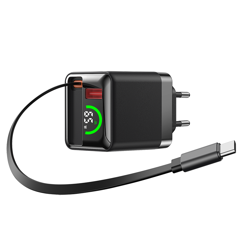 Chargeur USB-C pliable 65W GAN avec câble rétractable, adaptateur double port PD QC3.0, charge rapide pour iPhone, ordinateur portable, voyage