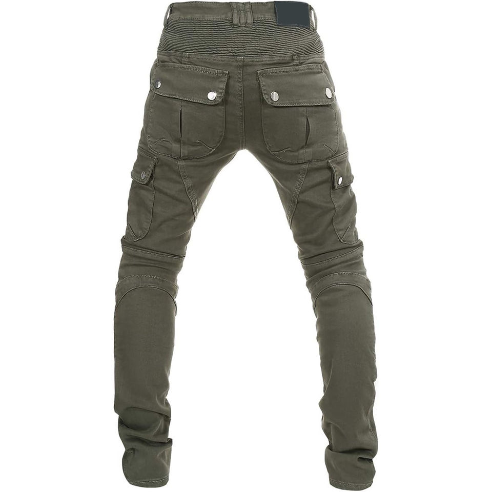 green mens biker denim jeans for men with cargo pockets and removable knee protectors