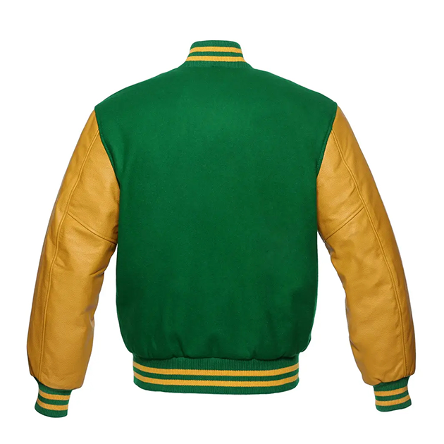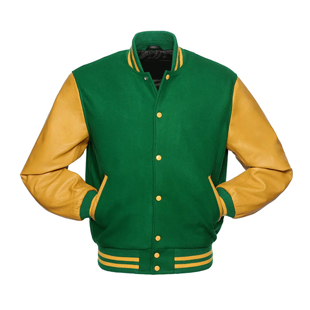 Veste universitaire verte pour homme avec manches en cuir, col montant, logo frontal - Veste universitaire en cuir personnalisée en gros, vestes pour homme