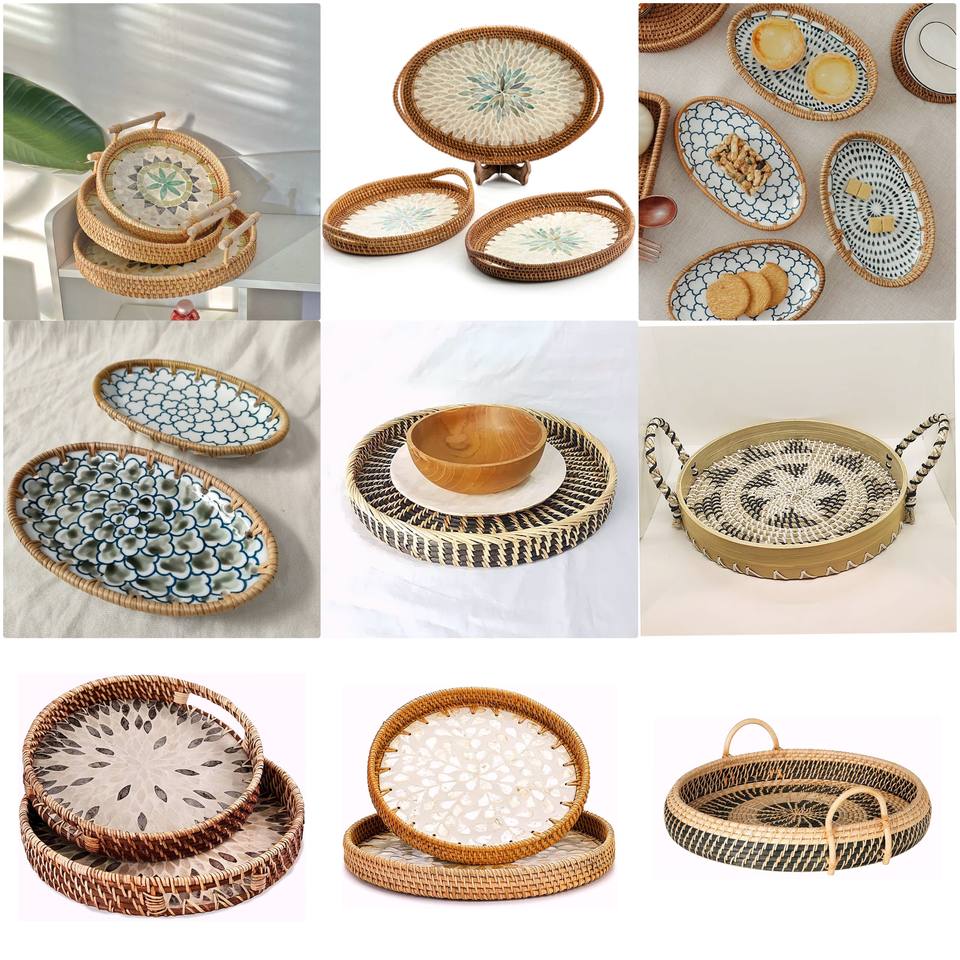 handmade rattan woven round storage tray - luxury colorful shell inlay decorative plate for living room & food serving