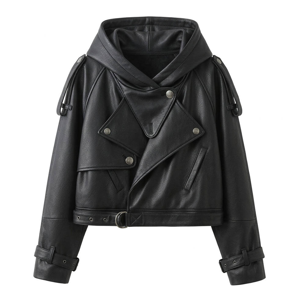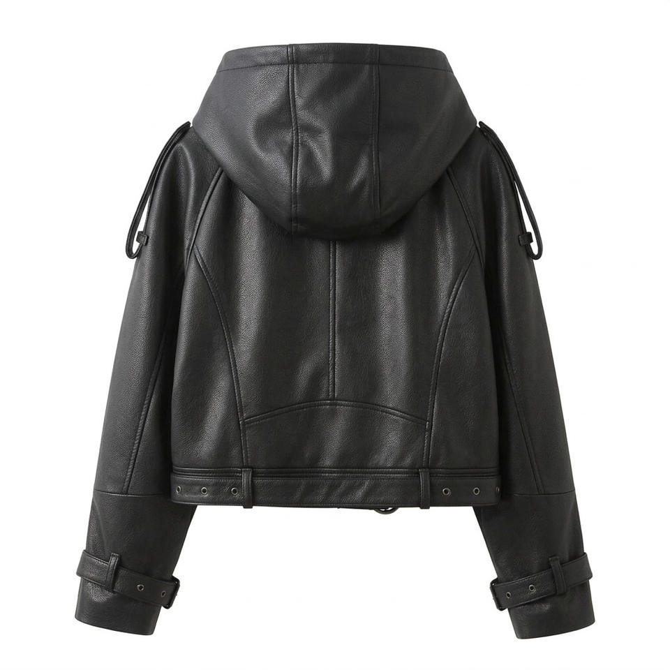 Blouson en cuir à capuche style urbain pour femme, coupe oversize courte, style motard, avec ceinture à la taille et poignets.
