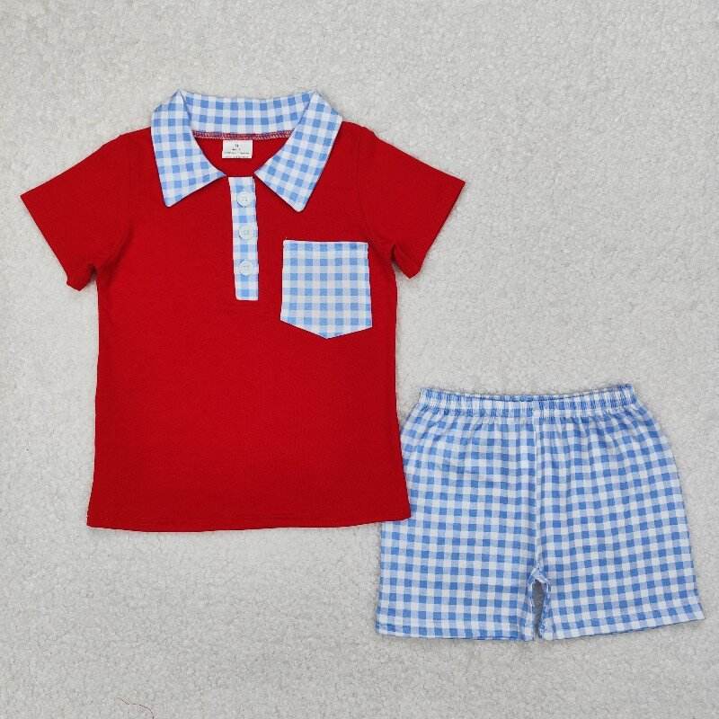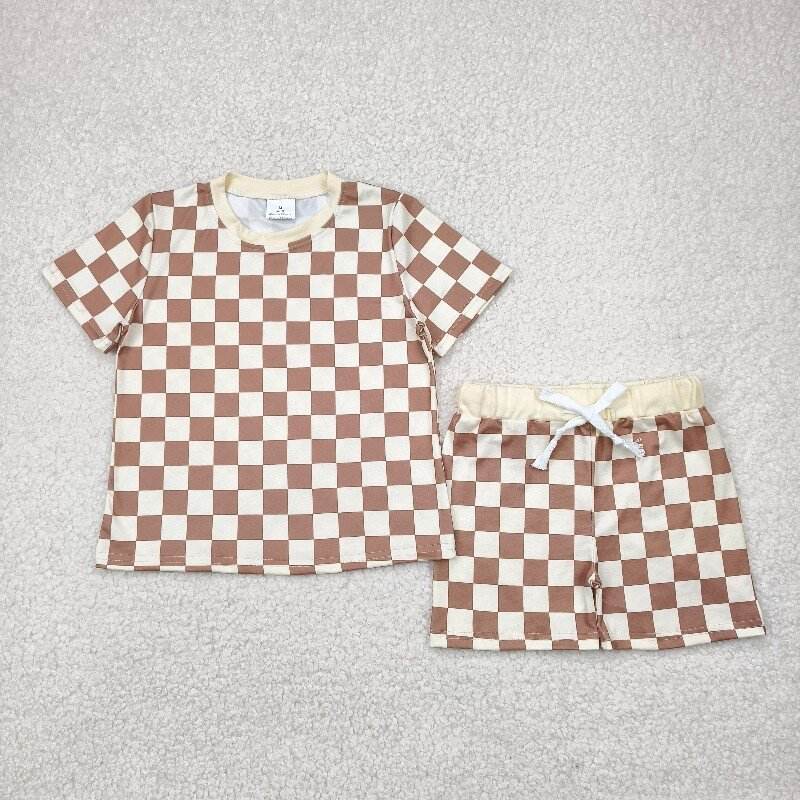 high quality Little Boy Boutique brown plaid summer outfits wholesale toddler boy RTS child clothing set with pocket