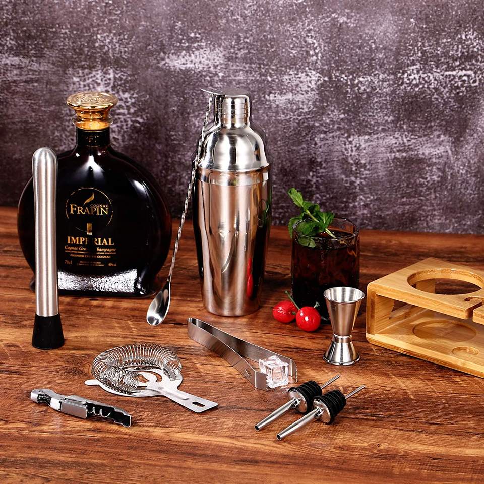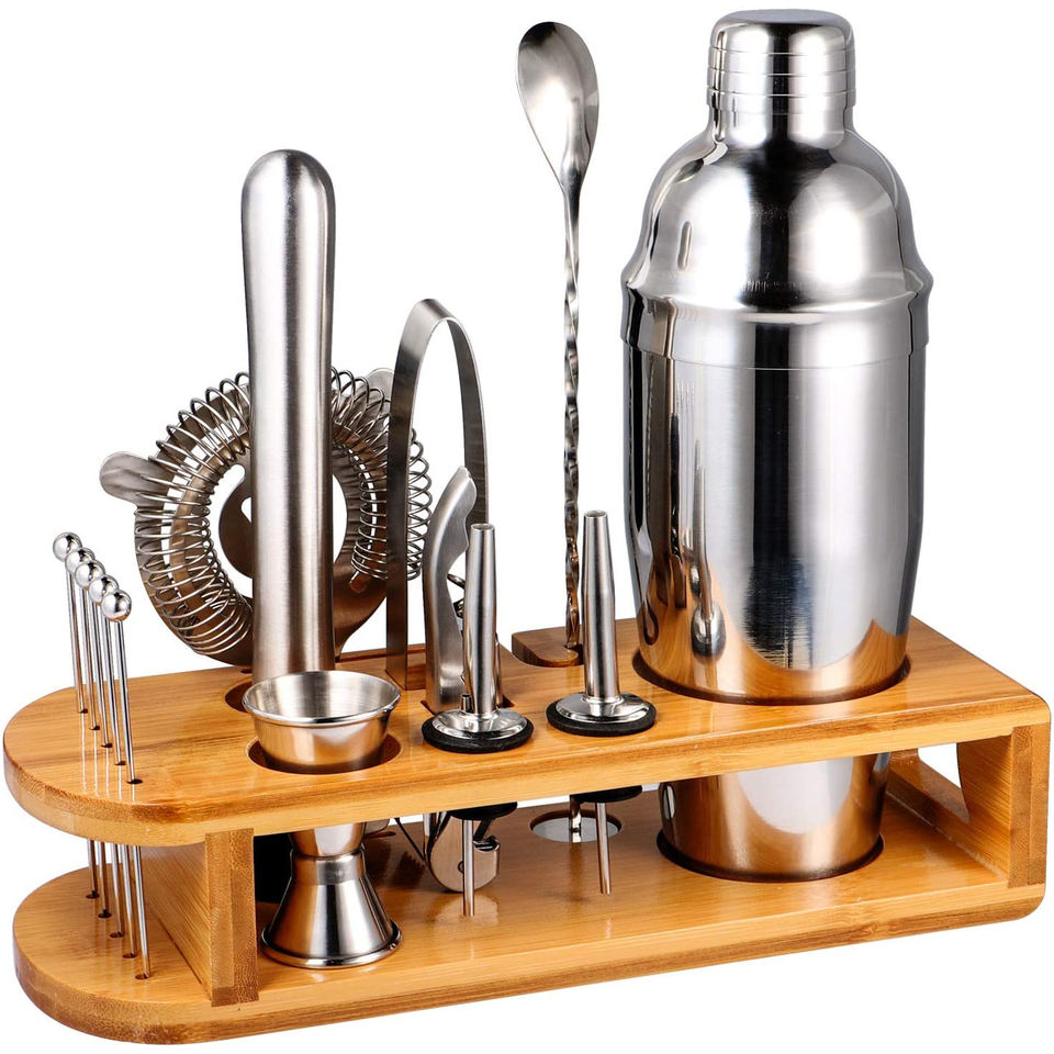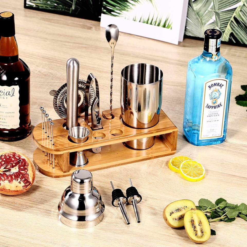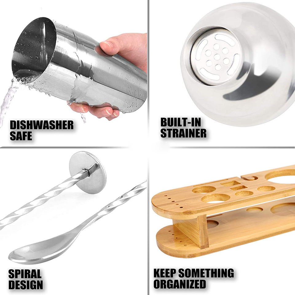 Vente chaude 2025 Cocktail Maker Sets Mix Drink Shaker Kit avec support en bambou, Martini Mojito Kit Perfect Home Bartender Mixing Kit Bar Tool