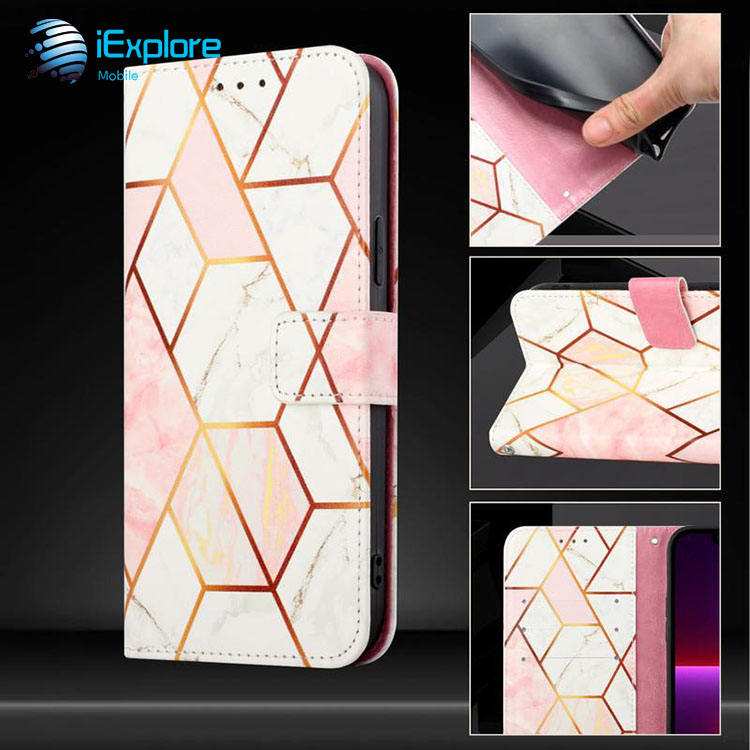 Étui portefeuille en cuir PU à motif marbre iExplore pour 17Promax Galaxy s25 A06 A16 A36 A56 M35 M55 Vivo Y77 Tecno Spark 8