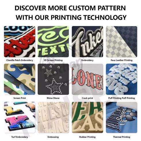 Printing Methods:Discharge Printing, Tie-dye, Puff Printing, Embossed, Heat-Transfer Printing, Digital Printing, Silk Screen Printing, Sublimation Transfer Print, silicone printing