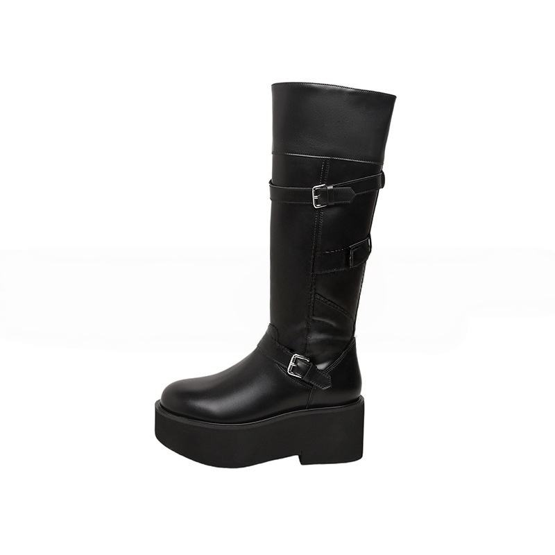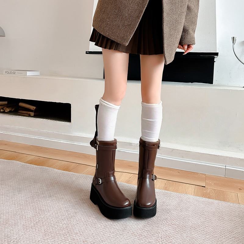 Bottines longues à talon plat pour femmes, style britannique, bottines Chelsea à boucle, bottines en cuir pour femmes