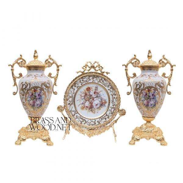 luxury antique porcelain and golden brass decorative centerpiece set floral painted vases with ornate plate elegant european