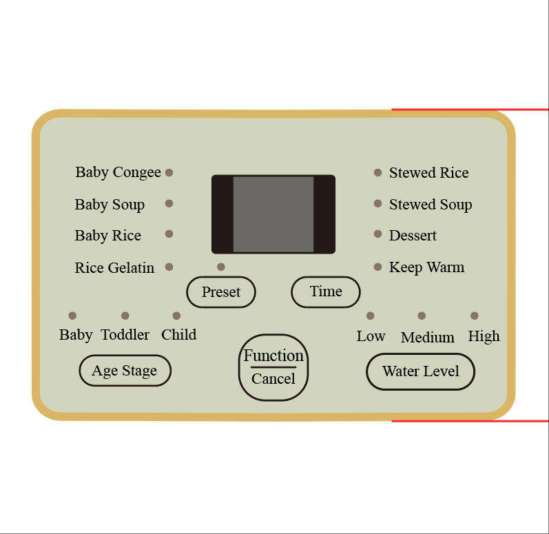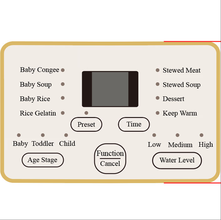 Baby Congee, Baby Soup, Baby Rice, Rice Gelatin, Stewed Meat, Stewed Soup, Dessert, Keep Warm, Preset, Time Control, Water LevelFonction