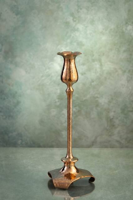 Pièce de travail du métal probablement fabriqué à partir d'aluminium étant donné sa teinte dorée chaude et sa surface texturée Bougeoir Décor à la maison