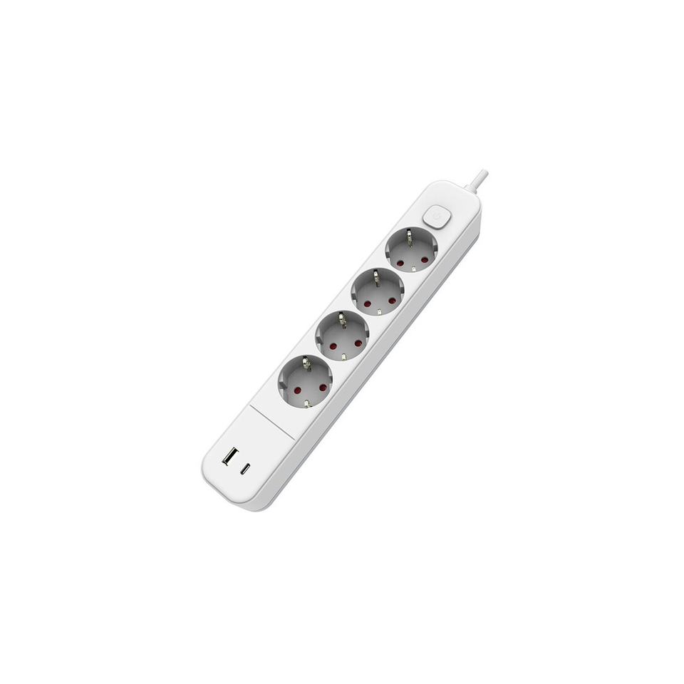 Multiprise 4 prises avec câble de 1,5 m, USB A et C, couleur blanche, idéale pour charger et connecter des appareils électroniques.