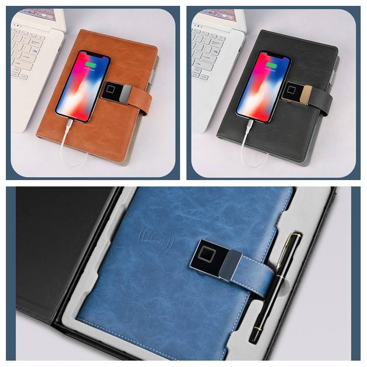 nouveau bloc - notes de banque de puissance de verrouillage d'empreintes digitales en cuir fou avec enregistrement Bluetooth