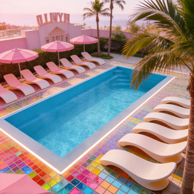 Piscine en fibre de verre à thème plage avec entrée en perles naturelles, bord de piscine, refroidisseur d'eau de piscine, carreaux lumineux