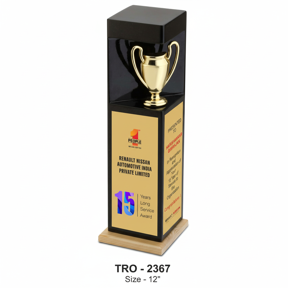 Trophée rectangulaire de reconnaissance professionnelle avec accent de coupe dorée et base en bois pour les services de longue durée