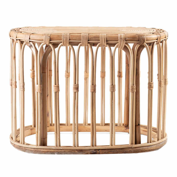 Table à manger ovale de style rustique écologique avec base en rotin, design antique artisanal pour les intérieurs de maison et de café