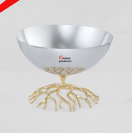 shiny look silver finished metal stailess steel serving bowl with golden designer stand for hotel restaurant and bar