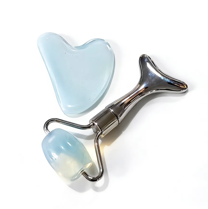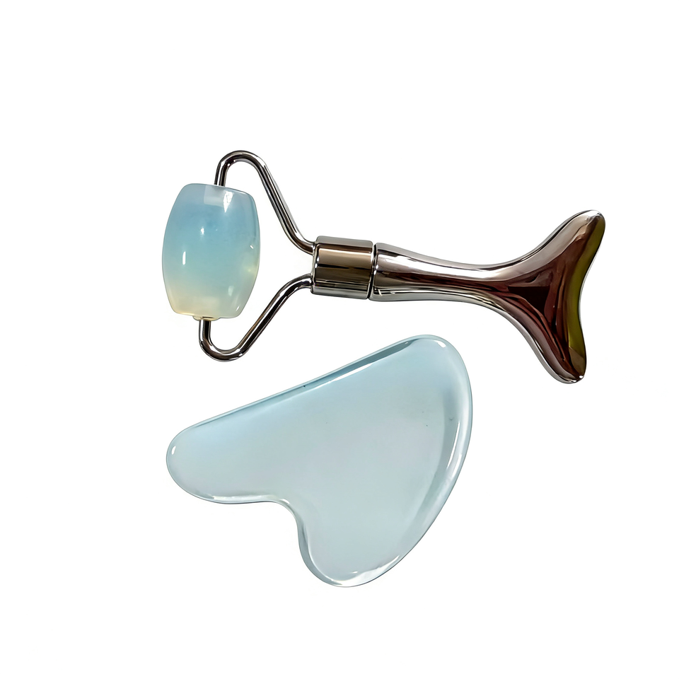 Nom du produit:Ensemble de soins pour la peau comprenant un rouleau de jade Gua Sha en opalite et des accessoires.