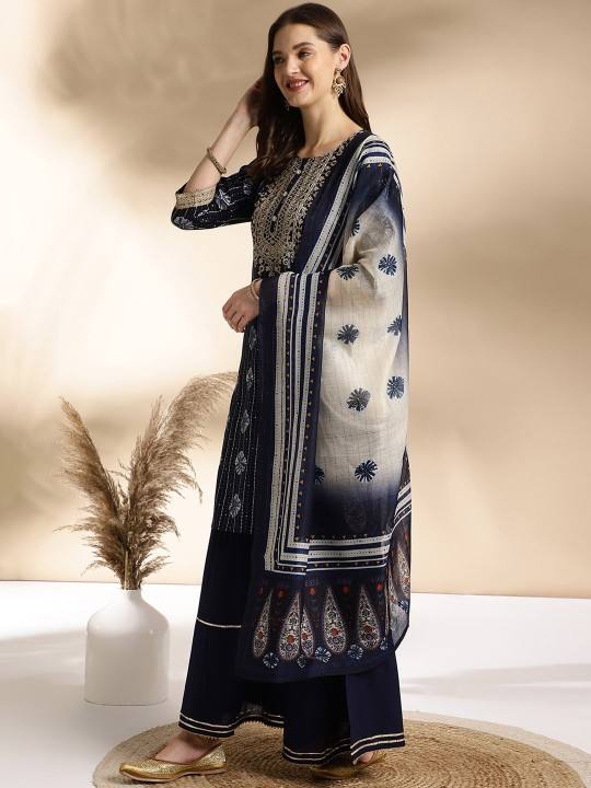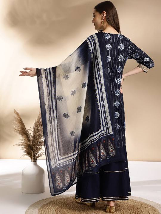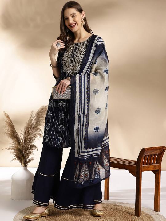 women Blue Ethnic Motifs Embroidered Round Neck Straight viscose rayon Kurti Sharara & Dupatta indian pakistan salwar kameez