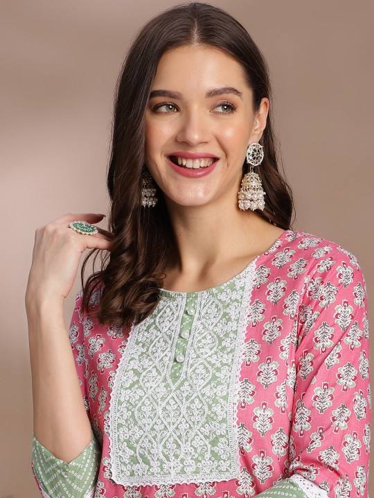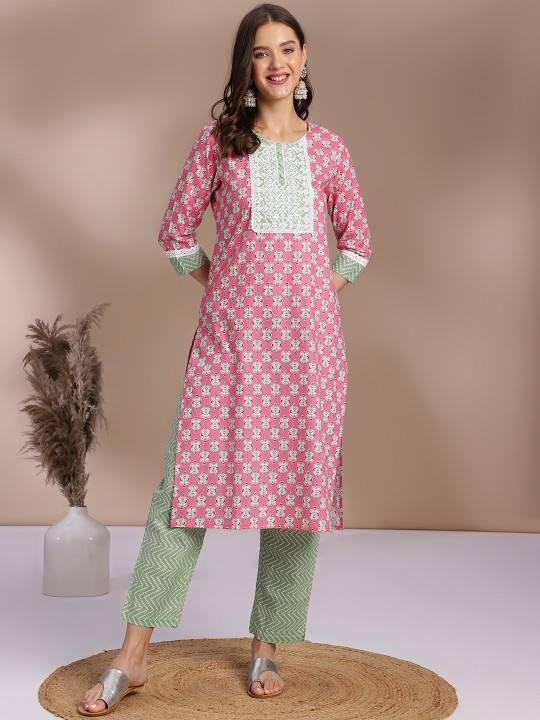 women Pink Ethnic Motifs Printed Thread Work Pure Cotton Straight Kurta With Trouser indian pakistani salwaar kameez suit