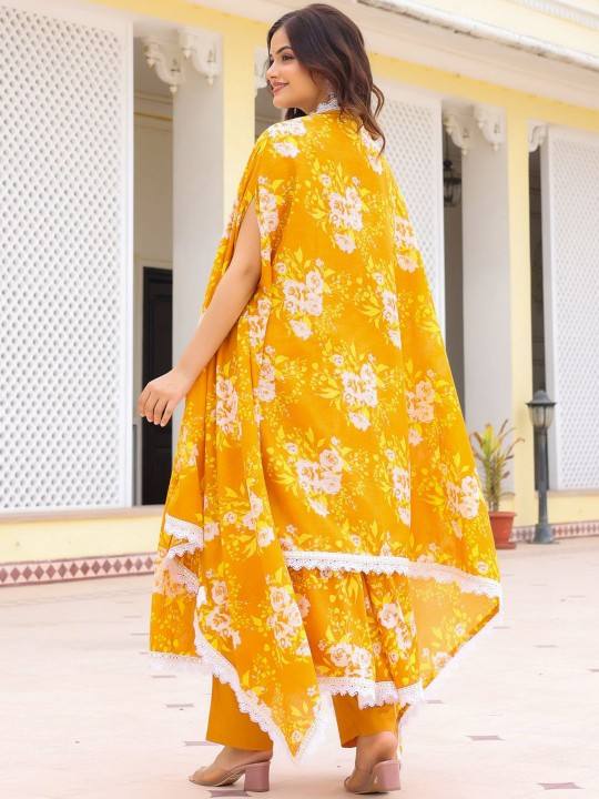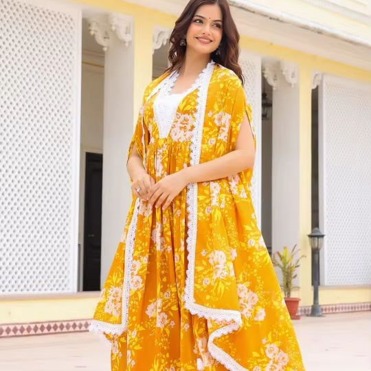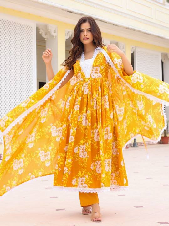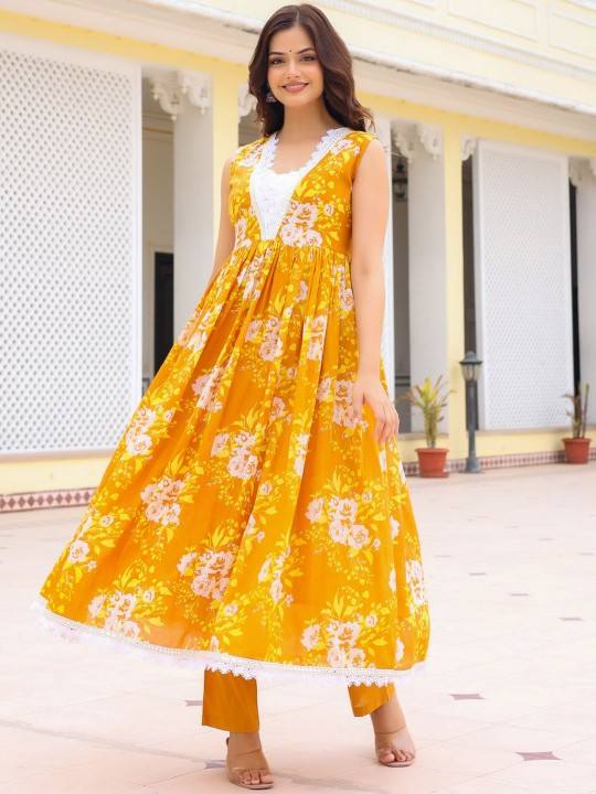 women ethnic Floral Printed V-Neck Thread Work Pure Cotton A-Line Kurta With Trousers & Jacket indian pakistani salwaar kameez